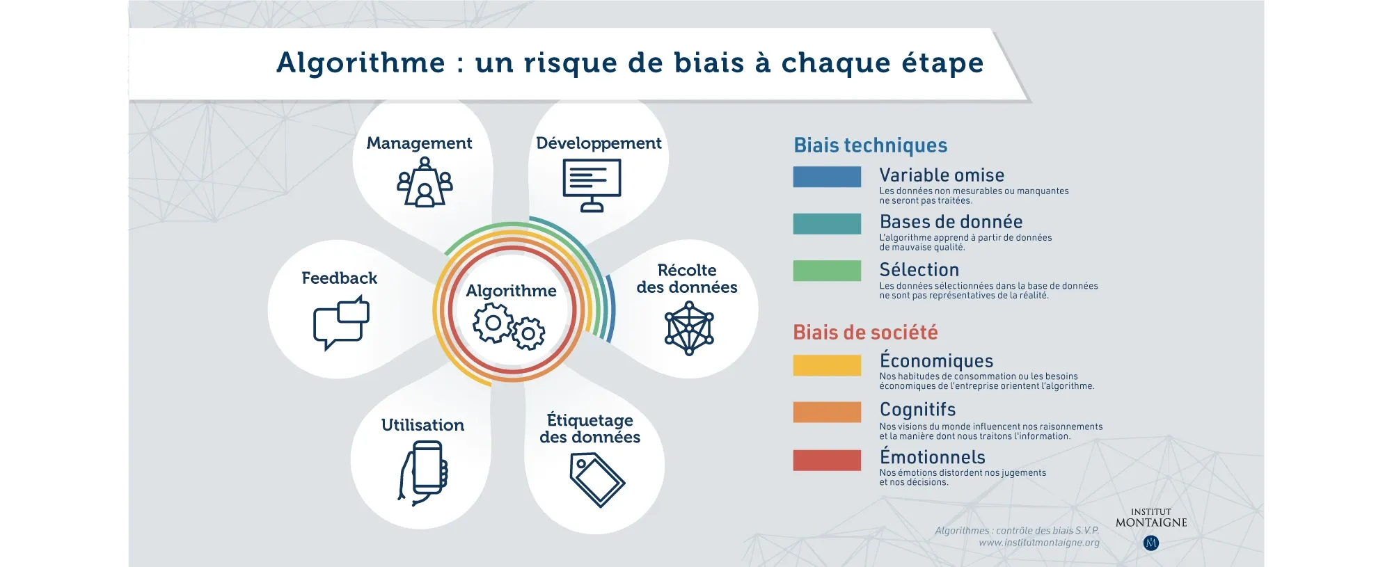 Dans certains cas, ces biais peuvent entraîner des discriminations. C’est-à-dire que l’algorithme aboutit à des propositions différentes selon, entre autres, que la personne soit d’un genre ou d’une origine ethnique spécifique. — Institut Montaigne