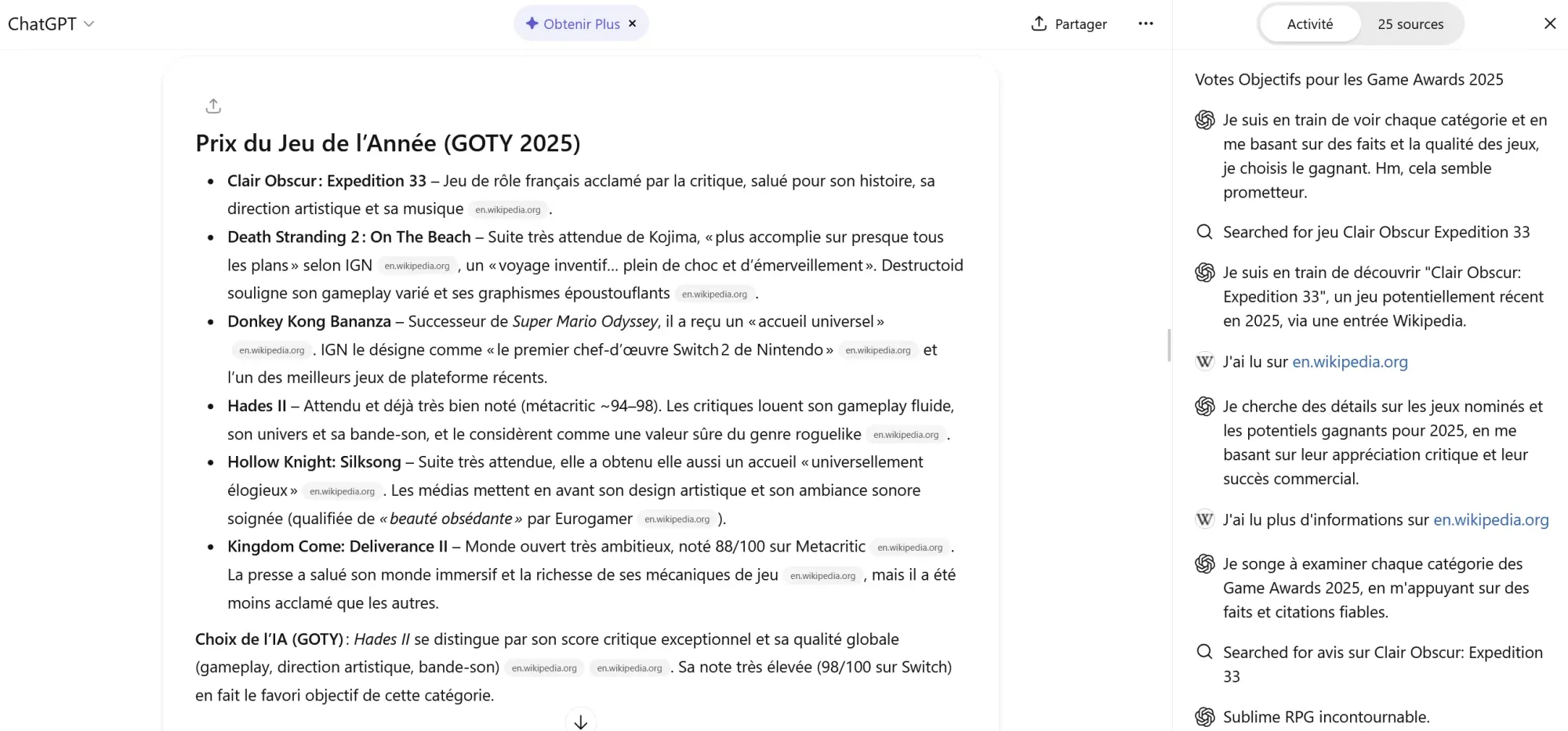 Le système de raisonnement de ChatGPT est particulièrement bien pensé. Une barre latérale apparaît à droite et affiche les étapes prévues (sous forme de checklist) ainsi que les sources consultées, qui se complètent progressivement. Pour chaque catégorie, l’IA détaille d’abord son raisonnement jeu par jeu, puis annonce son choix final. Cela peut créer un léger effet brouillon, puisqu’il faut se rendre au bas de chaque paragraphe pour connaître le verdict. Les sources, quant à elles, apparaissent à la fois dans les sections concernées et en fin de réponse, un peu comme sur Wikipédia.