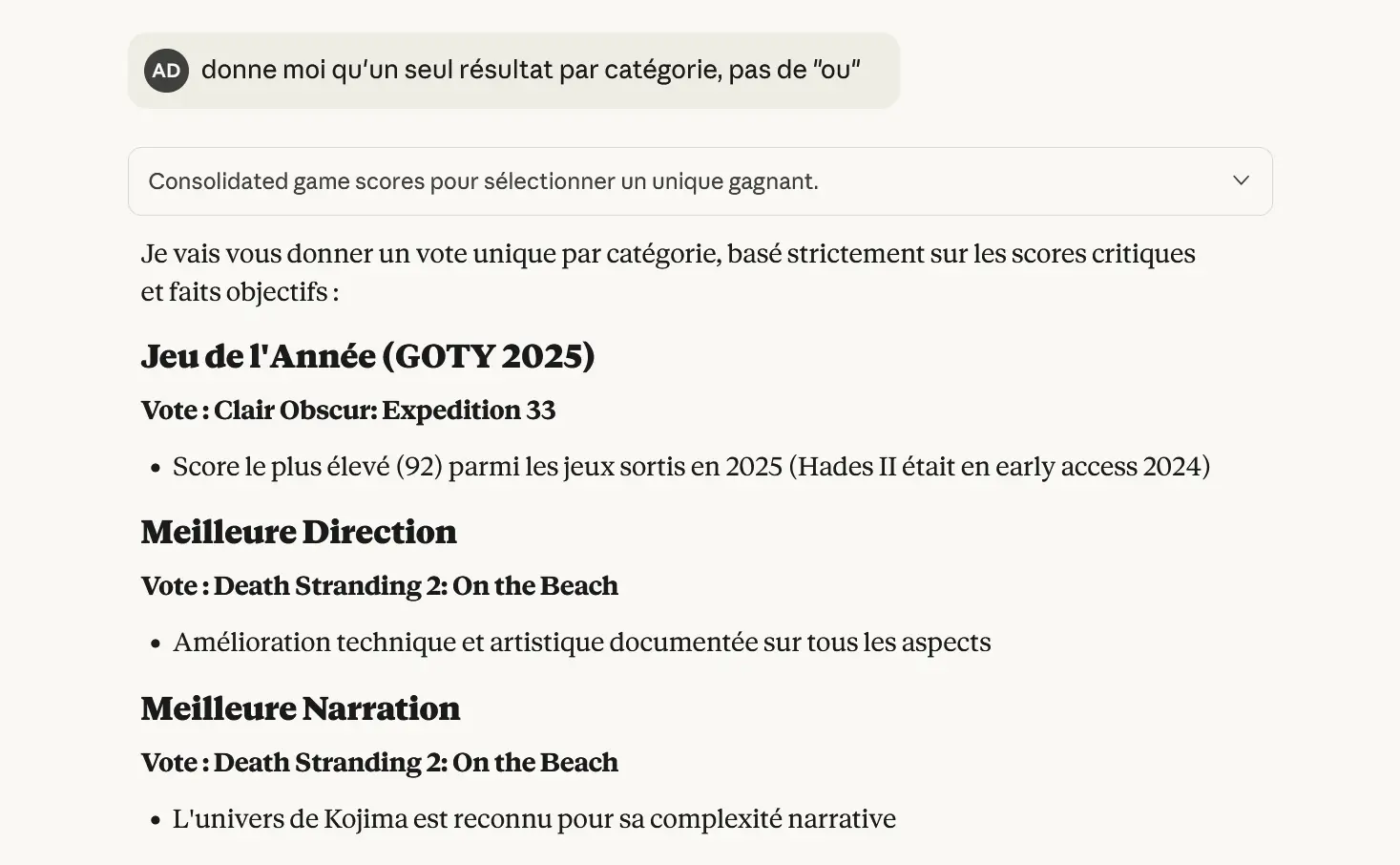 Pour autant, elles ne sont pas à éviter, les IA permettent d’accomplir rapidement certaines tâches humaines, tant qu’elles ne reposent pas sur des critères subjectifs ou sensibles. Dans cet article, par exemple, j’ai utilisé Gemini 3 pour créer le tableau des votes, un autre tableau recensant les nommés au GOTY avec leurs notes metacritic et opencritic, et, comme pour tous mes articles, j’ai confié la correction orthographique et syntaxique à ChatGPT. Ce sont des tâches fondées sur des données tangibles (et dont le travail pour un humain est fastidieux), même si une relecture reste indispensable pour éviter les erreurs d’interprétation (et j'en ai tout le temps).