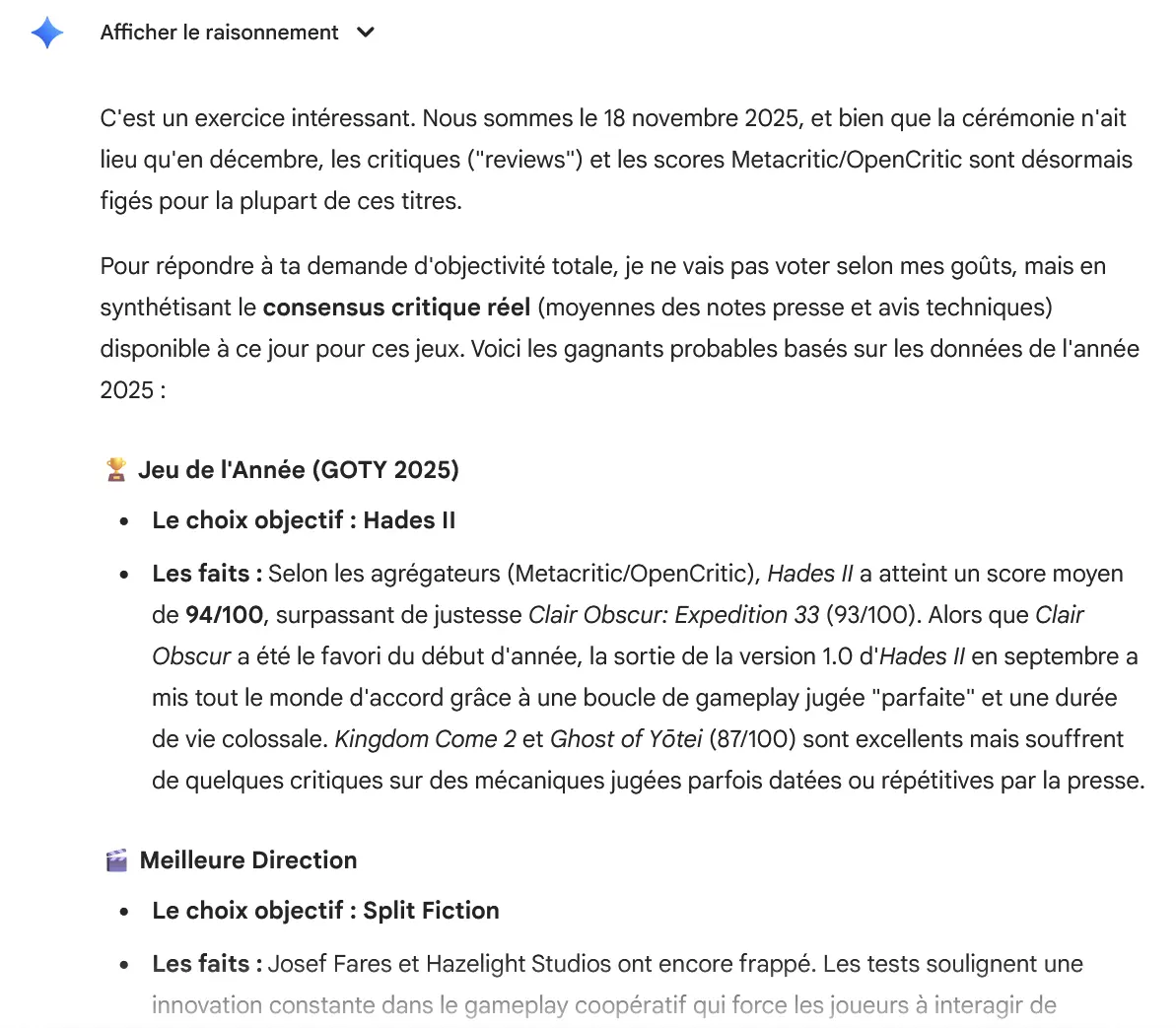 On comprend donc que la note ne fait pas le GOTY et cela crée une réflexion hors sujet de la part des IA car de par leurs raisonnements flous, même avec la possibilité de voir la réflexion qu’elles ont, il se peut qu’elles ne comprennent pas exactement le prompt et donnent ainsi un résultat faussé avec un semblant de ce que l’on voulait. Ainsi parmi les 4 chats conversationnels que j’ai testés dans cet article, 2 m’ont donné comme GOTY Hades II en expliquant qu’il avait la meilleure note Metacritic sans savoir comment est élu un GOTY car ce titre n’est pas décerné au jeu avec la meilleure note, il est décerné à celui qui a eu le plus gros impact sur l’industrie. Si Overwatch a obtenu cette récompense c’est exactement pour cette raison, car il a ouvert la voie à une nouvelle façon de faire du multijoueur : un mélange de MOBA et de fast FPS que l’on appellera par la suite hero shooter. Son impact n’a pas été si puissant qu’attendu, il faudra attendre plus tard pour voir des hero shooters exister et même disparaître avec Concord, mais il est la représentation d’une évolution dans le paysage. Le seul jeu qui n’a pas eu cet honneur c’est Fortnite car le thème du battle royale existait déjà avant, que ça soit avec PUBG, Minecraft ou Arma. Si Gemini et ChatGPT avaient réfléchi sur l’impact des jeux nommés dans l’industrie ils auraient compris que c’est Clair Obscur : Expédition 33 le plus grand favori de tous car nonobstant d’avoir la meilleure note des utilisateurs Metacritic de l’histoire il a réussi le tour de maître d’être un chef-d’œuvre réalisé par un studio de près de 30 développeurs dont la quasi-entièreté était des juniors. Et même si cette année est très particulière car il y a plus de jeux indés nommés au GOTY que de AAA, les autres jeux indés sont en plus d’être des suites, soit provenant d’équipes plus expérimentées (Hades et KCD2) soit des équipes composées de millionnaires qui pouvaient finir le jeu quand ils le voulaient avec aucune pression financière (Silksong). Ainsi la seule IA qui a eu la présence d’esprit de me demander les critères pour un vote objectif a été Mistral AI. Bon malheureusement après il a oublié de me mettre la moitié des catégories dans le tableau récapitulatif… mais au moins lui il a essayé de faire un tableau récapitulatif.