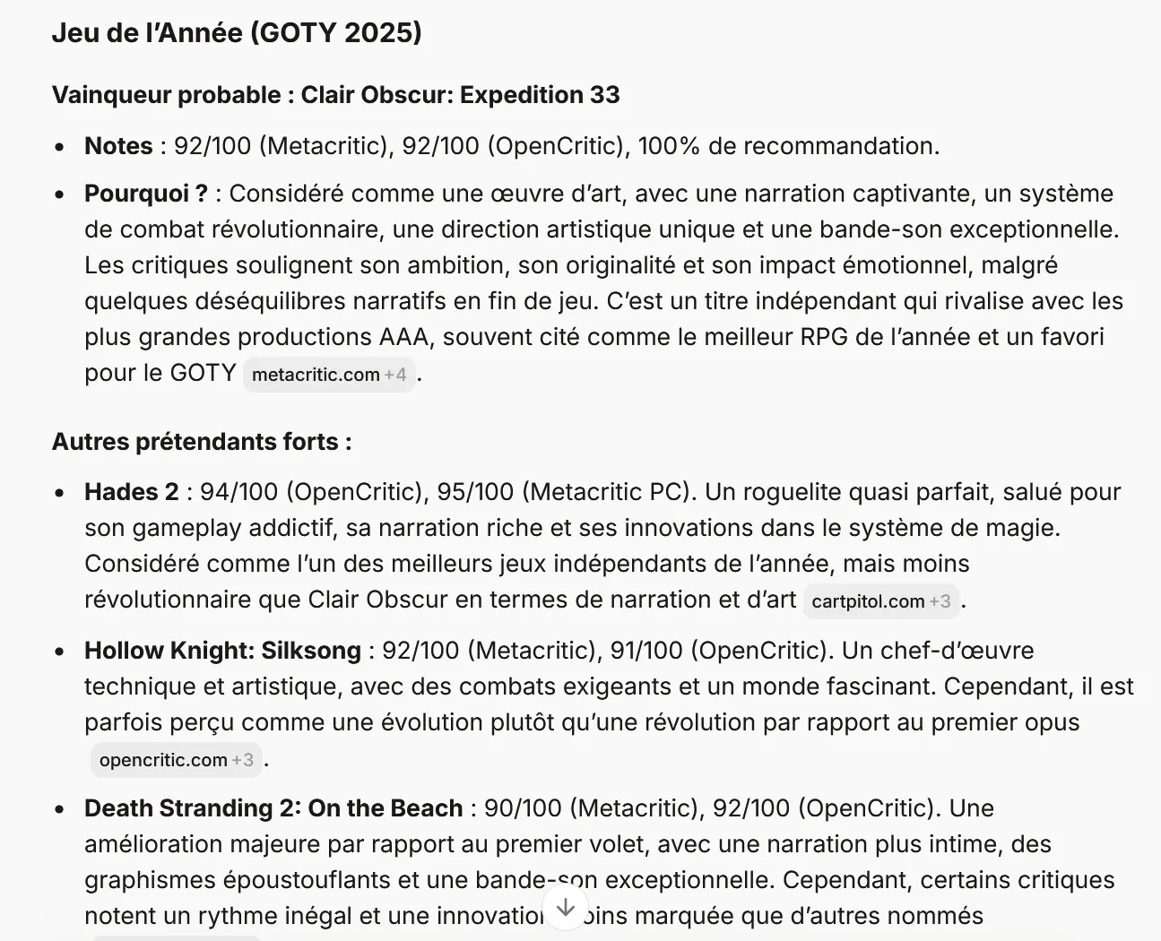 À partir de là, ses réponses ont été particulièrement bien organisées : gagnant, justification, puis les autres prétendants éventuels. Pour le GOTY, il a même fourni les notes Metacritic et OpenCritic avec les taux de recommandation, chose que je fait moi-même pour mes recommandations d’animes. Les sources sont présentes à chaque paragraphe, et l’historique des recherches reste discret.