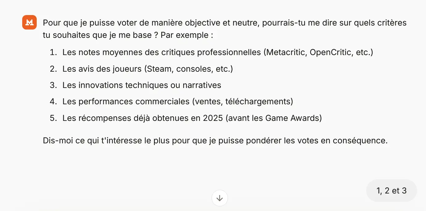 Pour Mistral, j’ai privilégié le mode “recherche”, présenté comme le plus avancé (compte tenu que je ne peut faire que 3 utilisations par jours). J’ai d’abord été agréablement surpris : avant de me répondre, Mistral m’a demandé de définir les critères d'objectivités pour le vote. Là où les autres IA se contentaient du prompt “vote neutre et objectif”, Mistral a compris qu’une vraie objectivité nécessite des critères mesurables. Je lui ai donc indiqué d’utiliser les notes des critiques, les avis des joueurs et le niveau d’innovation.